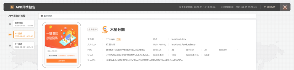 反编译APK获得基础信息:文件名、包名、哈希值、应用版本号、源码压缩文件列表等;