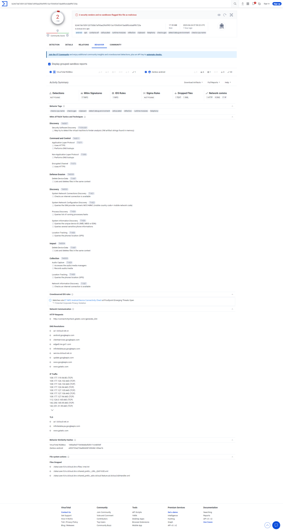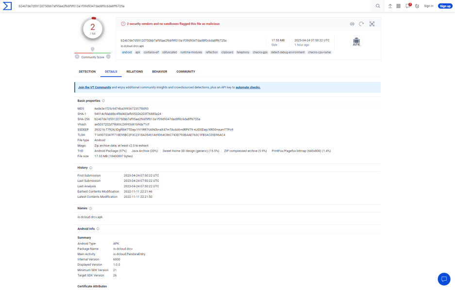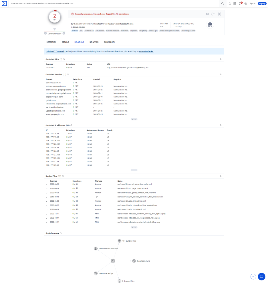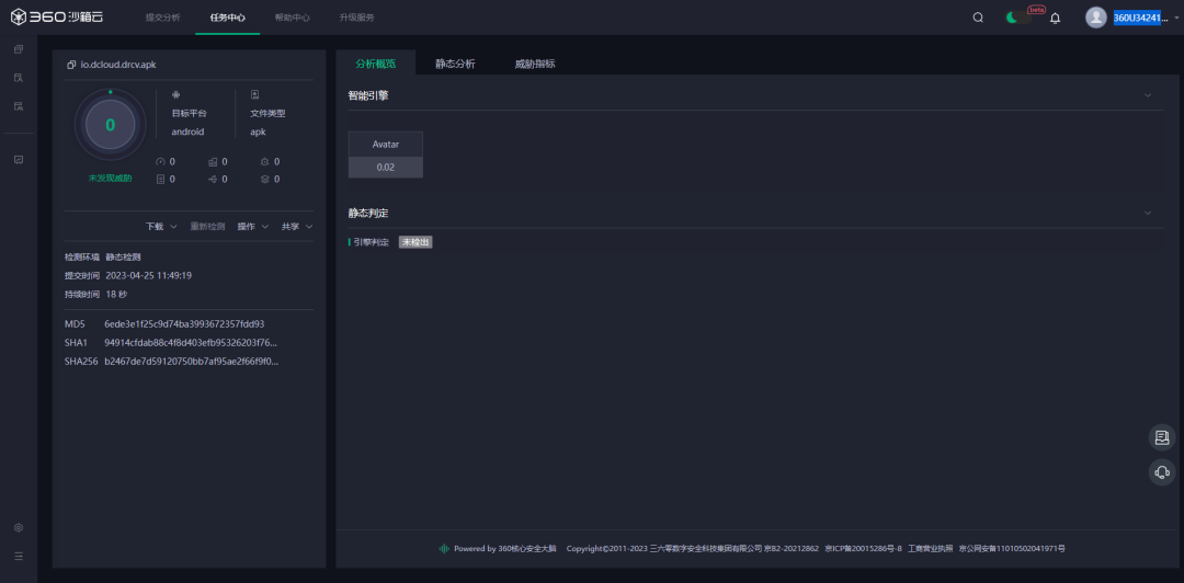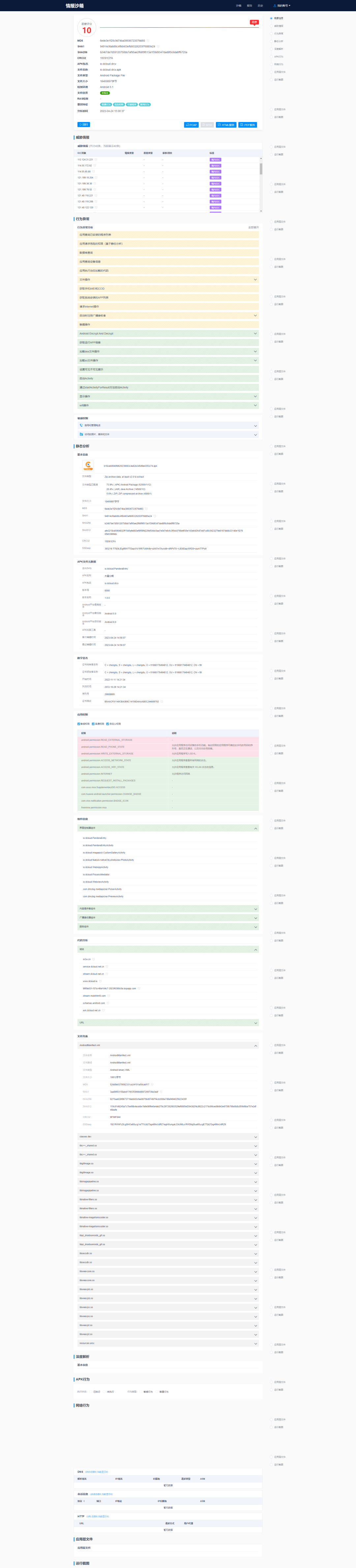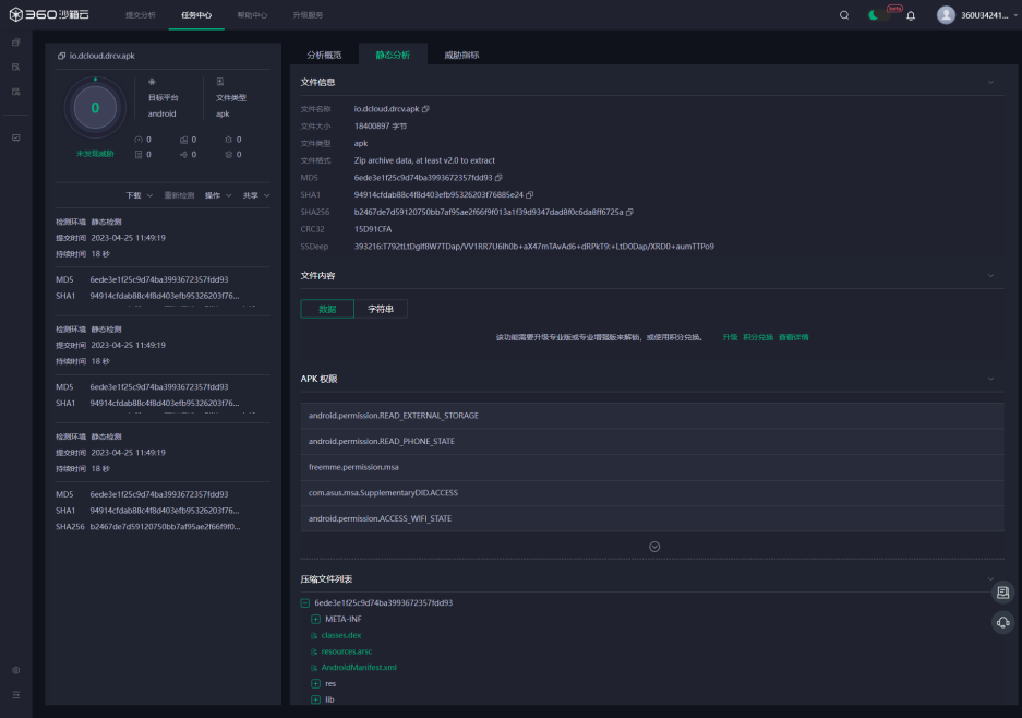 我们可以在无糖浏览器平台使用账号免费创建一个账号进行使用,上传样本后,后台分析得到下方的APK详情报告,报告内容如下: