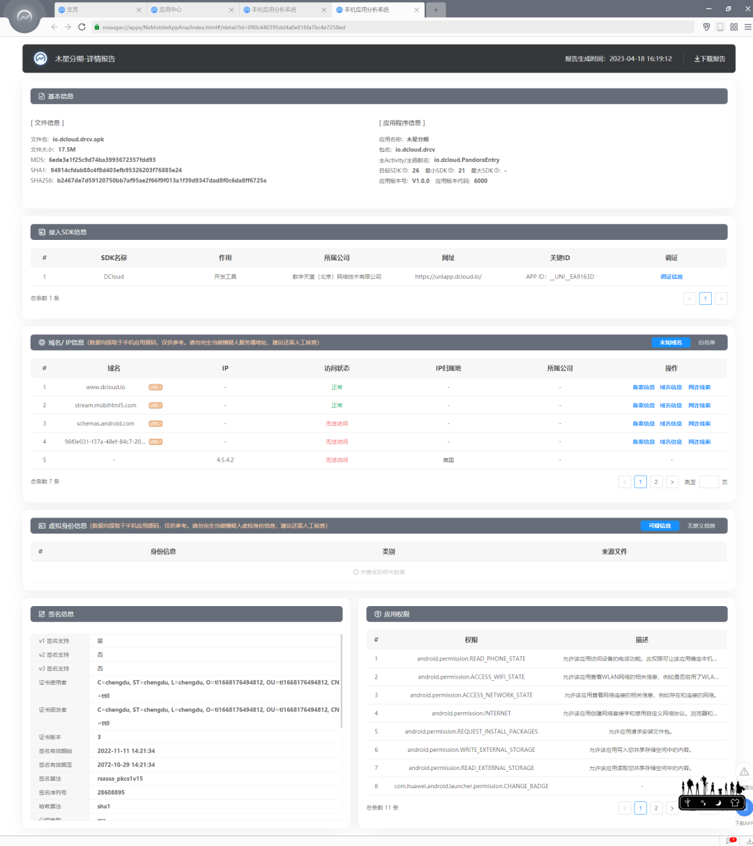 在无糖浏览器中直接使用手机应用分析系统上传样本APK,得到如下分析报告: