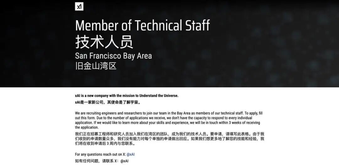 怎么说,符合条件的朋友看到这里,是不是已经跃跃欲试了?xAI 官网招聘链接如下,要不要尝试去跟马斯克做同事 👇招聘链接 🔗 :https://boards.greenhouse.io/xAI/jobs/4094282007值得一提的是,现年 52 岁的马斯克正以惊人的精力同时掌管着 6 家高科技公司:特斯拉、SpaceX、X(Twitter)、Neuralink、Boring company 以及 xAI。道格琼斯是马斯克的偶像,马斯克少年时期对他影响最深的一本书当属《银河系漫游指南》。书中有台超级计算机「Deep Thought」,它的任务是找出「生命、宇宙以及一切终极问题的答案」。乍一看,这不正与 xAI 的成立目标不谋而合。从前天马斯克前脚刚发预告,后脚就为星链获得柏林的授权而「鼓掌」来看,xAI 的研究成果充其量只是其野心的一环。他的野心并不局限于生成式 AI 技术。无论是给人脑植入微芯片的 Neuralink ,做类人机器人的 Optimus, 还是模拟人脑的超级计算机 Dojo,以及更智能的 Grok AI 助手,马斯克这些积极推进的项目都隐约指向一个终极目标:通用人工智能(AGI)。也就是指创造一个能像人类一样执行各种任务的智能系统,具有类似人类的智慧、自主决策和学习能力,能执行多种任务,并具备对世界的理解和推理能力,解决各种复杂问题。当然,这一终极目标的实现绝非易事,但马斯克,一个充满决心和野心,并总能把「吹的牛」实现的人,已经在这条充满挑战的道路上出发。![]()