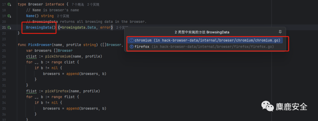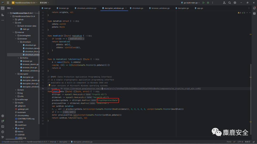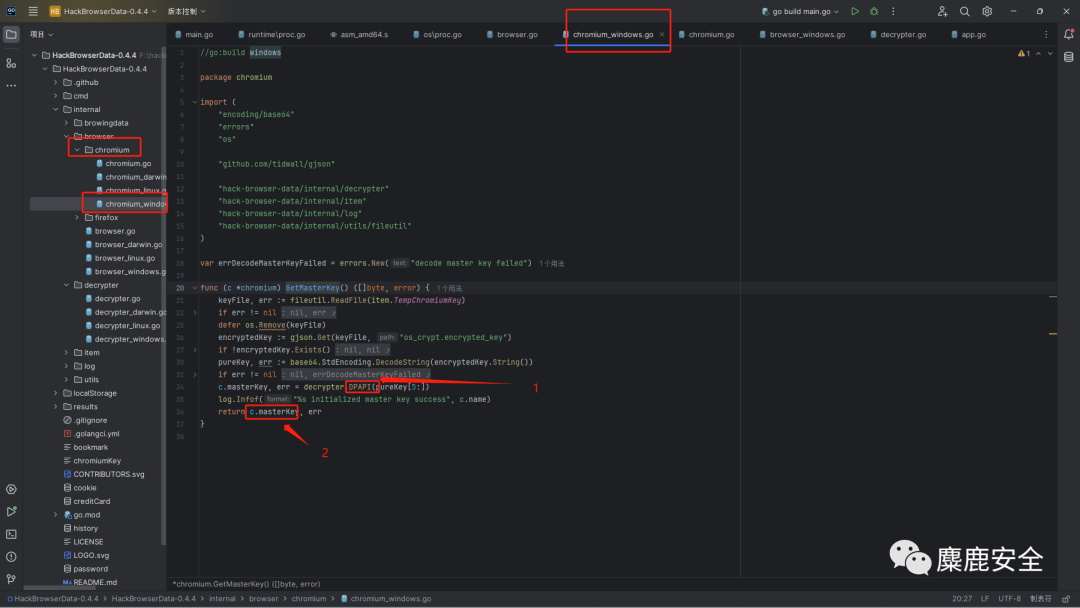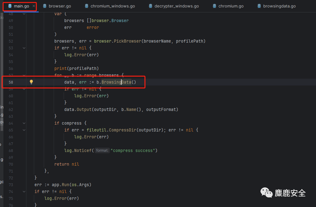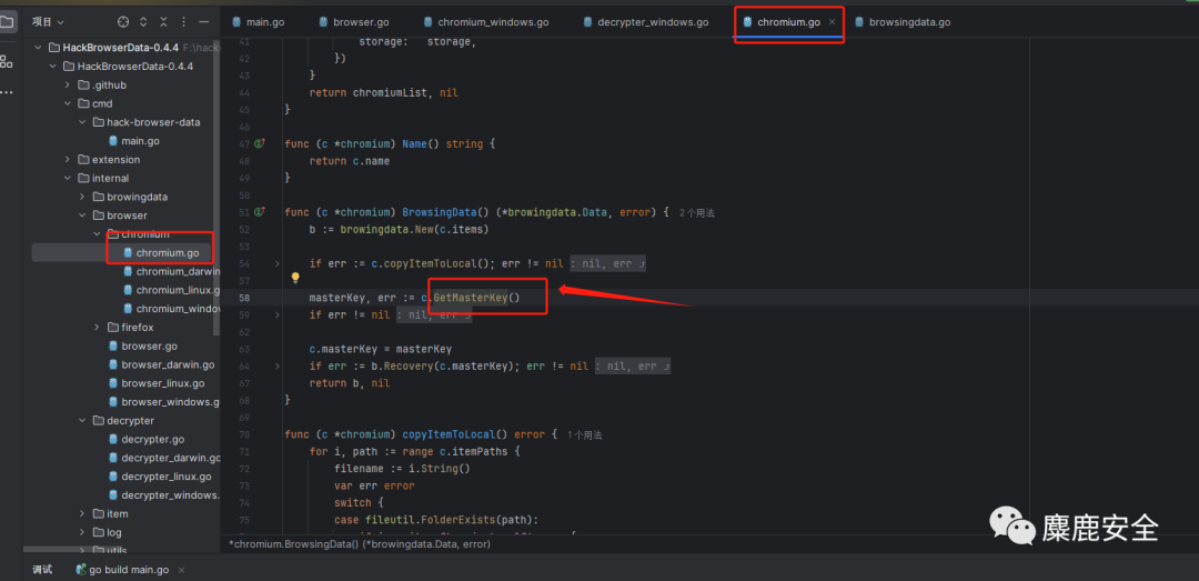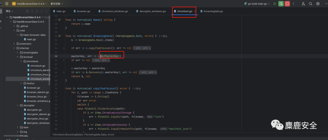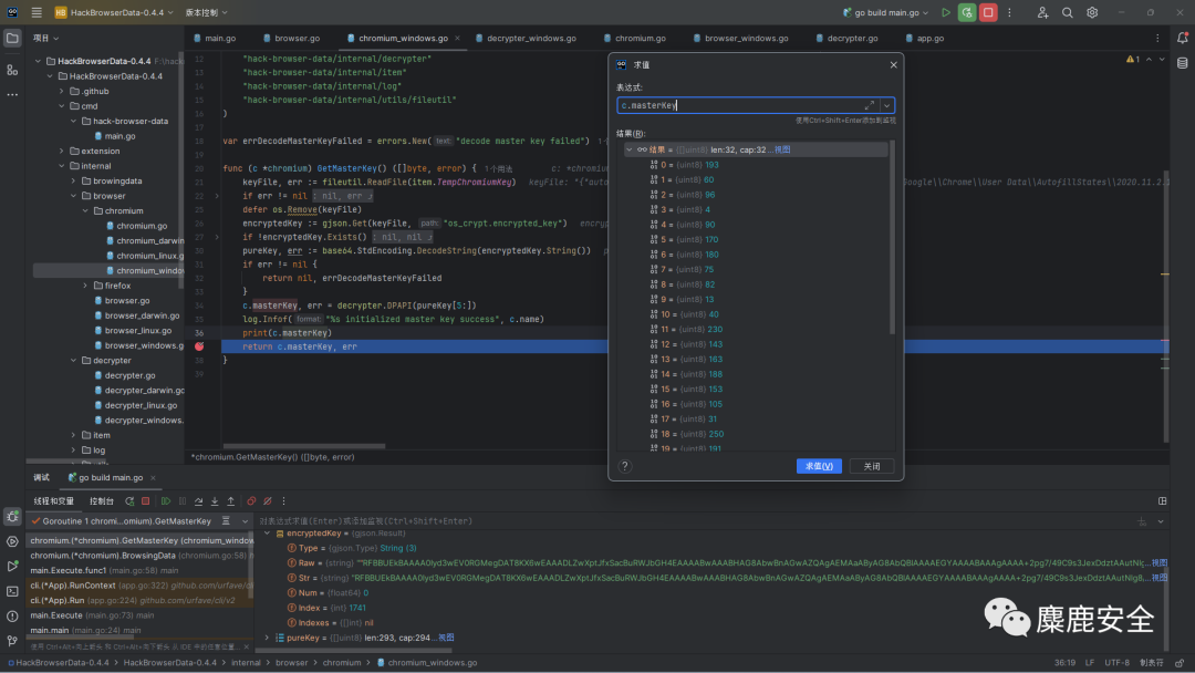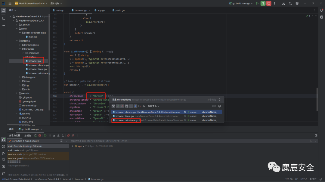 为了让读者直观的看明白HackBrowserData的运行过程,麋鹿y'bian一边调试一边原理