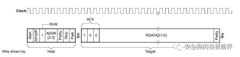 当必须更改数据方向时,将发送TRN(周转)周期。下图显示了 SWD 读取传输(来源 – 参考文献 7)。