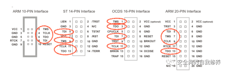 JTAG规范没有为连接器设计定义的协议。JTAG连接器的引脚接口数量有6、10、14、16、20等。除了 4 个 JTAG 信号外,这些连接器还可以有额外的信号。如下图所示(来源 – 参考 [1])