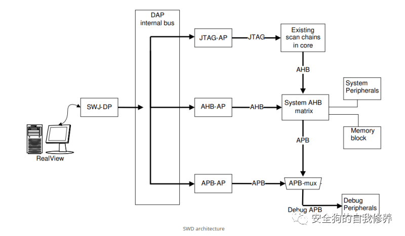 JTAG调试端口(JTAG-DP) – 它使用标准的JTAG接口和协议