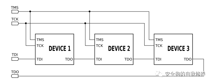 为了通过JTAG接口与器件通信,我们必须识别通过TAP与JTAG芯片状态机通信的4个JTAG信号TCK、TMS、TDI和TDO。也可以通过菊花链连接多个JTAG芯片来与它们进行通信,如下图所示(来源 - 维基百科上的数据)