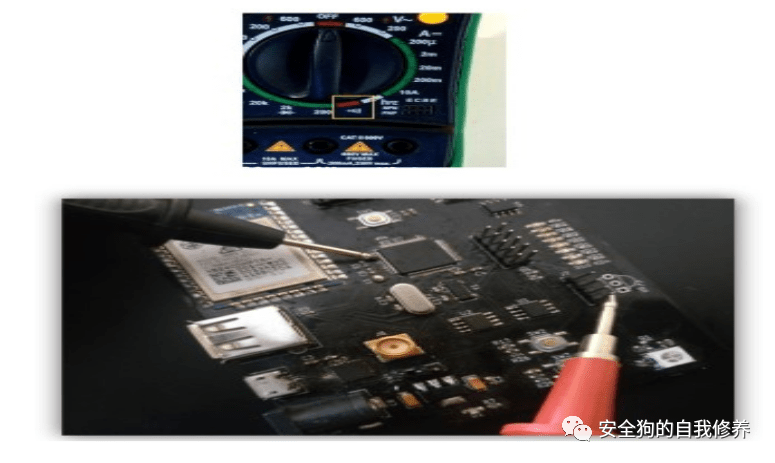 根据器件中使用的IC封装(此处为LQFP64),我们确定控制器上的JTAG端口引脚。然后,我们将万用表设置为连续模式,如下图所示: