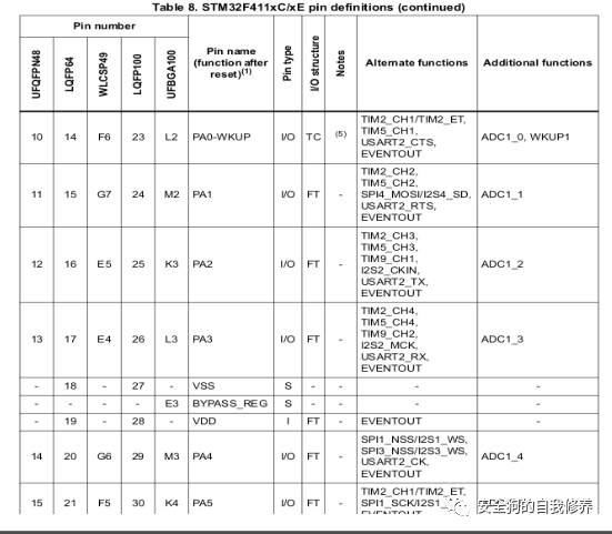 PCB上标记为U7的diva板中使用的微控制器是STM32F411x,我们可以在其数据表中搜索具有JTAG/SWD接口连接的引脚。下图显示了数据表的该部分。