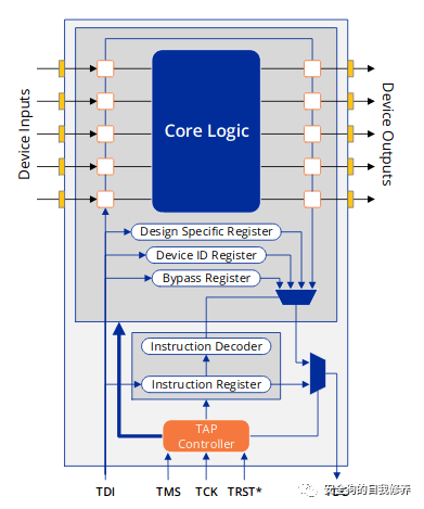 JTAG芯片由将芯片连接到PCB的逻辑单元或边界扫描单元组成。它们可以从引脚或内核逻辑信号捕获数据,并将数据发送到引脚上。这些逻辑单元可通过串行测试数据输入 (TDI) 和测试数据输出 (TDO) 接口访问。测试控制器提供逻辑访问的主要接口是测试访问端口(TAP),由4个必需信号和一个可选的复位信号组成。
