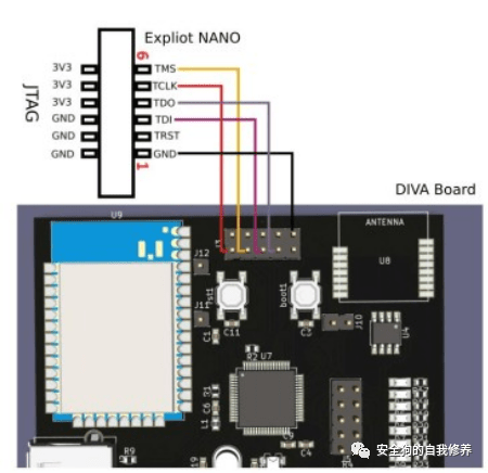通过上述任何扫描工具/方法识别JTAG引脚后,将JTAG引脚TCK、TMS、TDI、TDO与适配器上的相应JTAG引脚连接(此处,EXPLIoT Nano根据其数据表/用户手册)。连接图像如下所示。