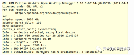 现在,为了与JTAG接口进行通信,我们需要启动Openocd。$ openocd -f expliot_nano_jtag.cfg