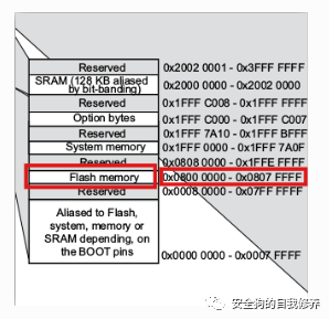 我们首先需要确定我们正在使用的芯片的闪存的地址和长度。如上所述,EXPLIoT DIVA板具有STM32F411x微控制器。我们检查其数据表,我们确定了0x8000000和长度的闪存地址,0x807FFFF – 0X8000000 = 7FFFF,如下图所示。