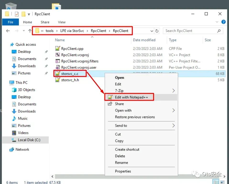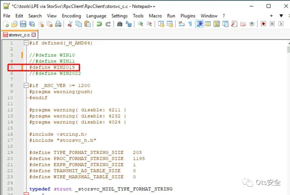 步骤 2 :虚拟机 (VM) 启动后,可能需要根据所使用的 Windows Server 进行特定的代码修改。为此,导航到工具文件夹并找到位于“C:\tools\LPE via StorSvc \ RpcClient \ RpcClient \ storsvc_c.c ”的名为“ storesvc_c.c ”的文件。使用 Notepad++ 打开该文件。