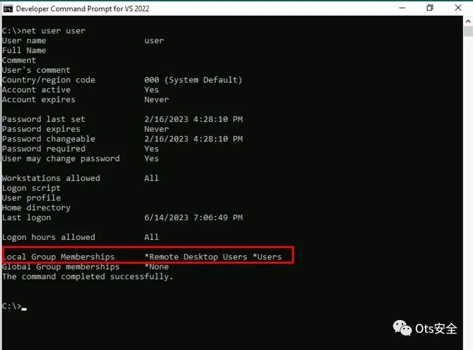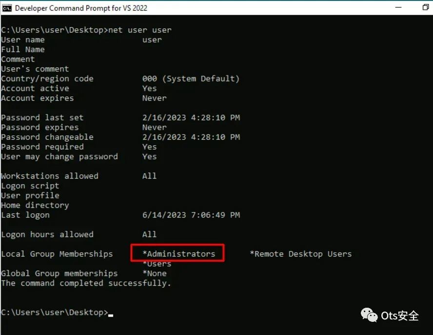 第12步:为了确认我们的漏洞利用成功执行,我们可以验证我们的用户是否已添加到管理员组。