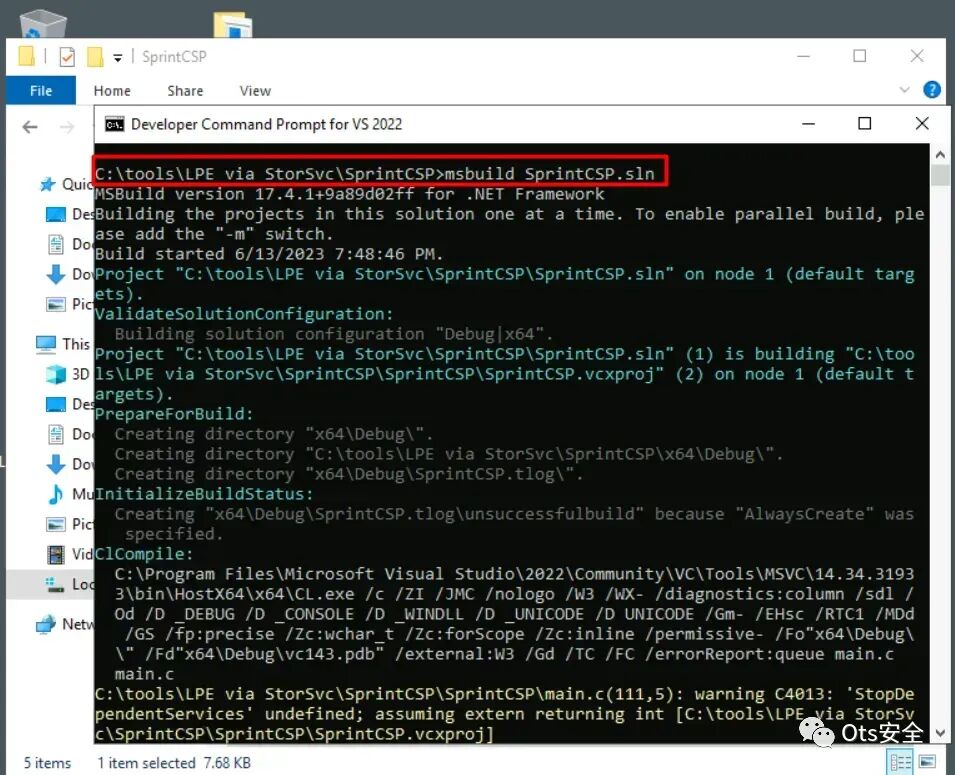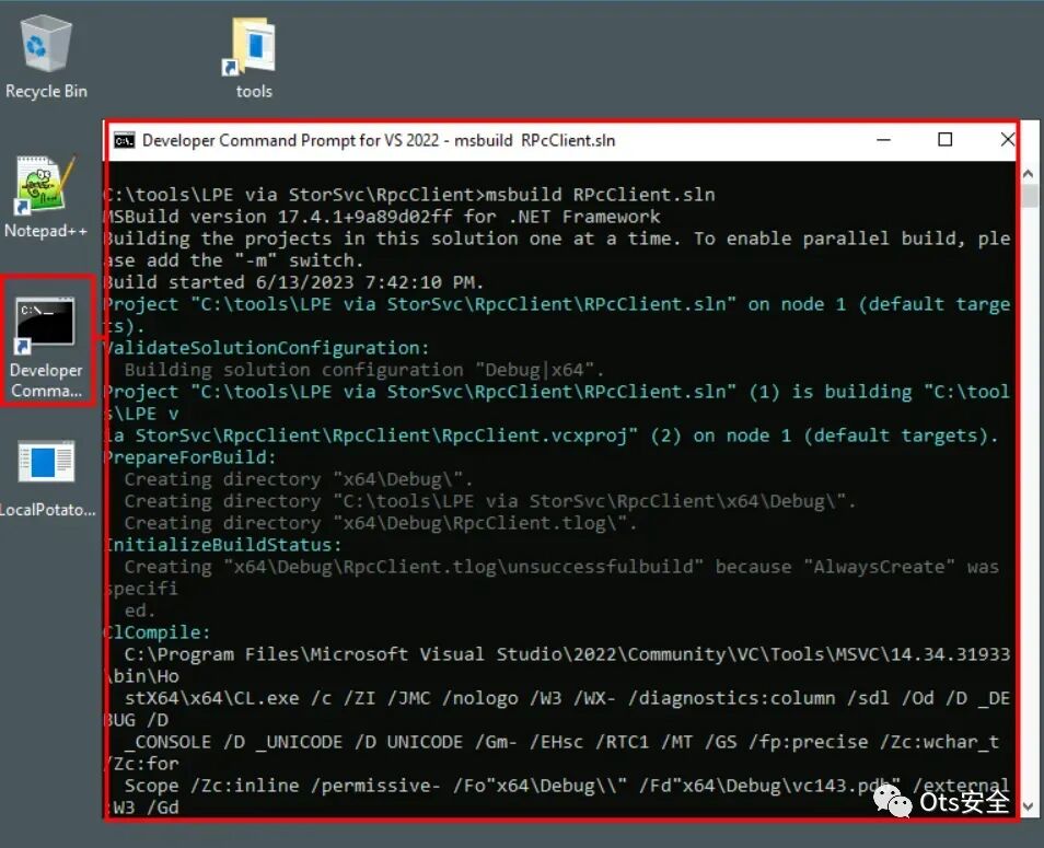 步骤 4:完成必要的调整后,漏洞将被配置为利用适用于 Windows 2019 的适当 RPC接口标识符。现在代码已得到纠正,让我们继续通过桌面上的快捷方式启动开发人员的命令提示符。为了成功构建项目,请执行以下命令:“ msbuild RpcClient.sln”。