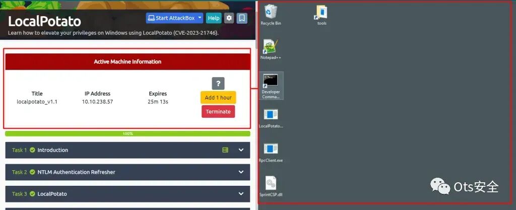 要利用此漏洞,必须拥有一个具有预配置设置的受控测试环境。为了获得实践经验并更好地了解此漏洞的复杂性,我们将使用 tryhackme 平台进行实践练习。您可以通过单击以下链接来访问特定的漏洞利用练习:https://tryhackme.com/room/localpotato。通过进行此练习,您将能够积极参与该漏洞利用并增强对其内部工作原理的理解