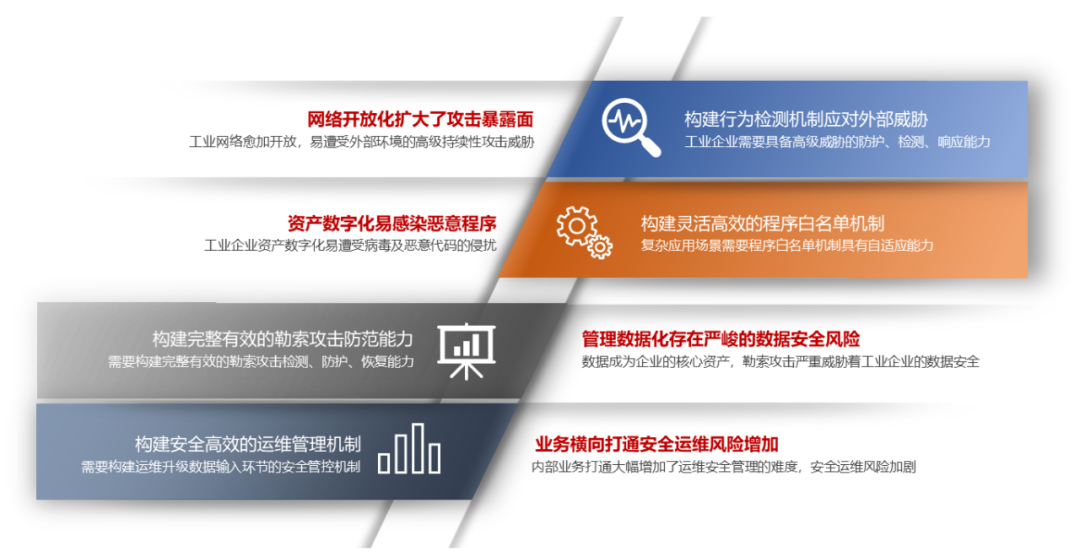 工业领域数字化进程中,企业资产从实体走向数字、生产网络愈加开放、内部业务全面打通、经营管理全面数据化,数字化变革提高了企业生产效率,但也加剧了网络安全风险,包括攻击暴露面扩大、易遭恶意程序侵扰、数据安全风险严峻以及安全运维风险等。