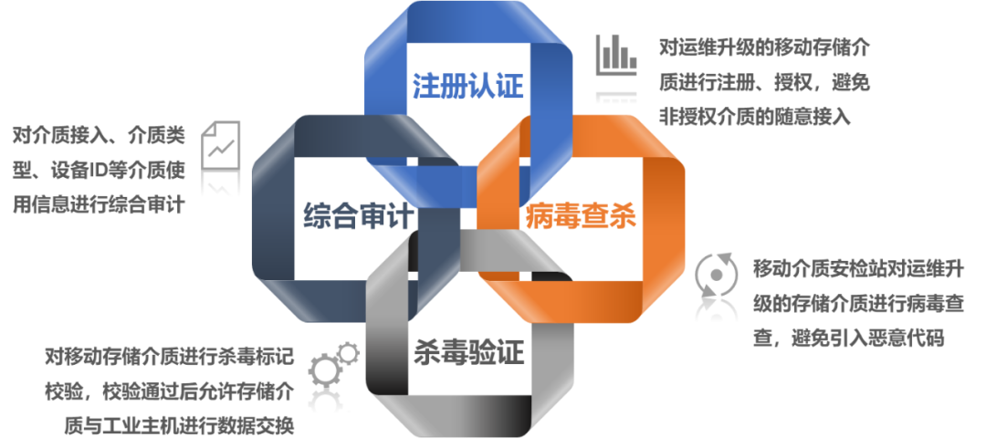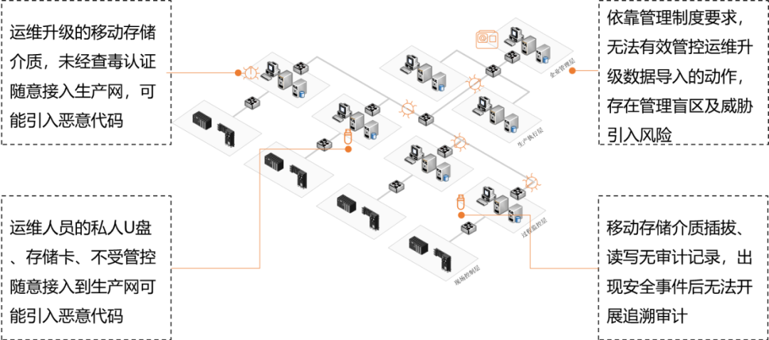 内部业务打通有助于企业高效的业务协同,但安全风险可能在全网快速蔓延,由于运维环节的移动介质是主要的风险来源,需要在运维升级的数据输入环节增加安全检验机制,并与企业管理制度紧密衔接,实现安全高效的运维管理。