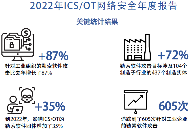 管理数据化使得数据成为工业企业的核心资产,而勒索攻击严重威胁着工业企业的数据安全,据Dragos发布的《2022年ICS/OT网络安全年度报告》指出,2022年工业领域遭受的勒索软件攻击比2021年增长了87%,工业领域已成为勒索病毒最主要的攻击目标,工业企业需要构建完整有效的勒索攻击防范能力。