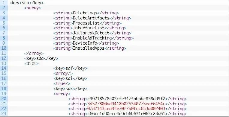 正如从攻击链图中看到的,这个验证器在部署TriangleDB植入程序之前启动。JavaScript验证器是一个脚本,与之相反,这个验证器是一个Mach-O二进制文件(因此得名binary Validator)。启动时,它使用AES解密其配置。这个配置是一个plist: