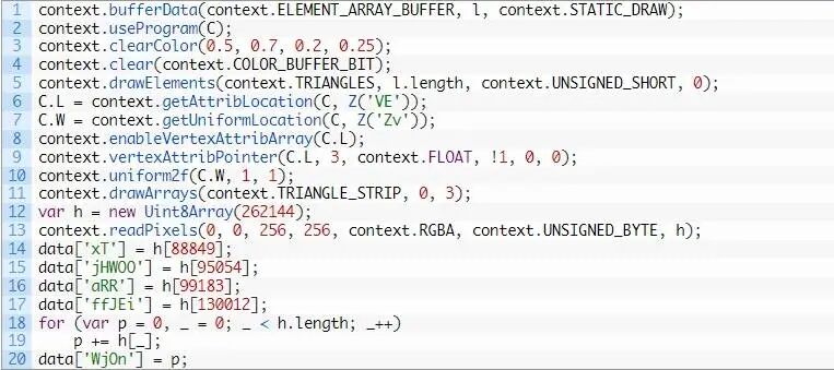 如上所述,它通过使用WebGL在粉色背景上绘制一个黄色triangle并计算其校验和来执行一种名为Canvas Fingerprint的指纹技术:
