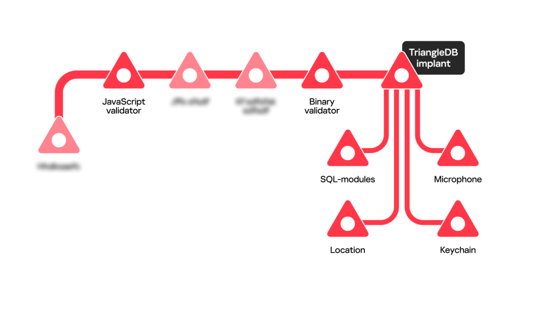 在之前的文章中,研究人员概述了Triangulation活动攻击链:设备接收恶意iMessage附件,启动一系列漏洞利用,其执行最终导致启动TriangleDB植入。攻击链可以用下图来概括: