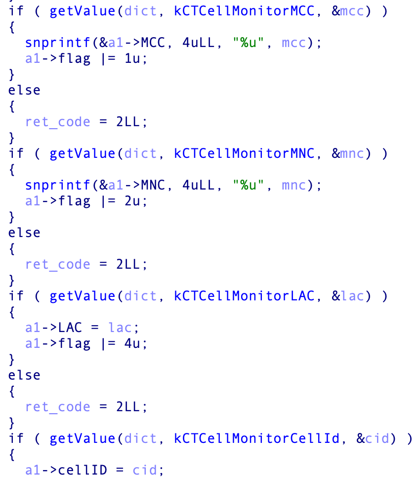 这个模块在一个单独的线程中运行,并试图模拟被授权使用配置中指定的位置服务的bundle(例如/System/Library/LocationBundles/Routine.bundle)。除了使用GPS确定位置外,它还使用GSM,通过CoreTelephony框架检索MCC (MobileCountryCode), MNC (MobileNetworkCode), LAC (LocationAreaCode)和CID (CellID)值。