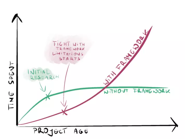 框架最大的好处之一就是节省时间。运行一个命令就可以得到一个功能齐全的项目。框架通常提供一个固定结构的项目,而且如果你不知道如何做,它会有很大帮助。但与大多数其他技术决策一样,它不是没有代价的。