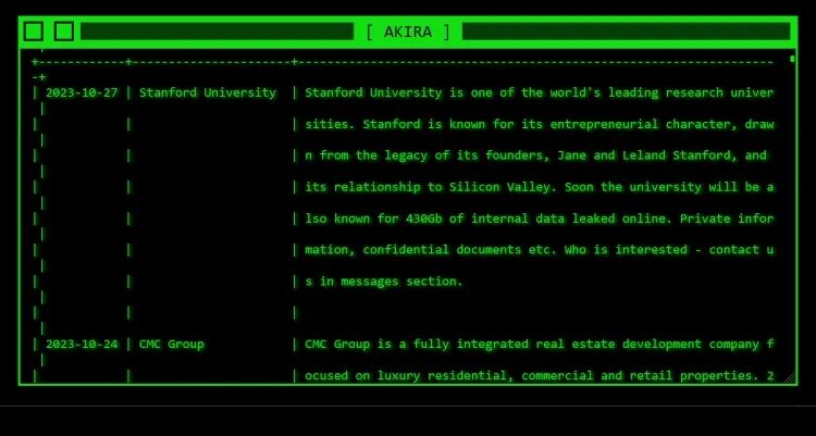 前不久,Akira勒索软件团伙声称他们攻击了斯坦福大学并窃取了430GB的数据。Akira调侃,斯坦福大学之前“以其企业家精神而闻名”,但眼下很快就要因其430 GB内部数据泄露而闻名了。Akira声称拥有斯坦福大学的私人信息和机密文件,并威胁称如果斯坦福大学不支付一笔未指明的赎金,将会在网上泄露这些信息。