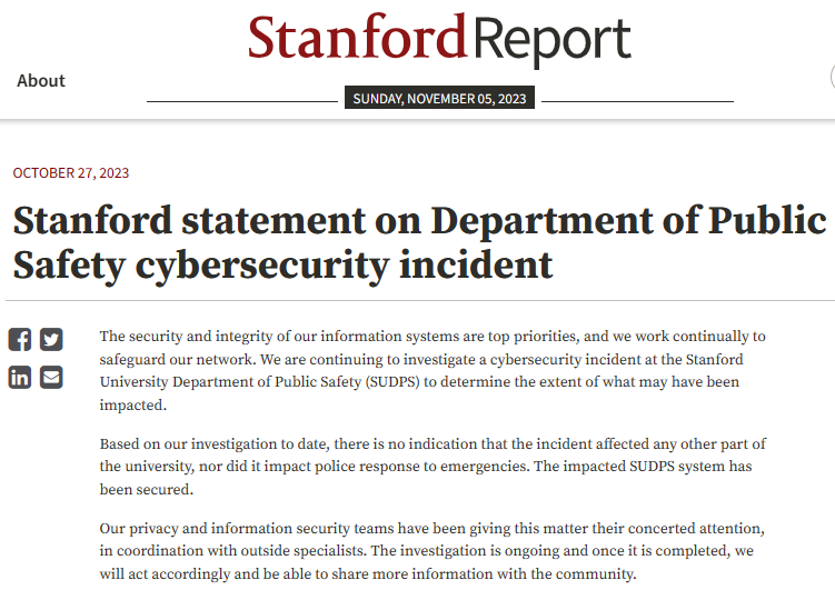 斯坦福大学的声明证实了遭到攻击一事,并表示此次攻击仅限于斯坦福大学公共安全部(SUDPS):“根据我们迄今为止的调查,没有迹象表明此次事件影响了大学的其他部分,也没有影响到警方对紧急情况的响应。受影响的SUDPS系统已得到保护。”