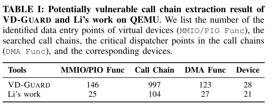 表1比较了VD-GUARD和之前的工作在静态分析QEMU中可能存在漏洞的调用链的情况。VD-GUARD识别的数据入口点(146个)明显多于之前的工作(25个),这是由于其使用了更全面的分析方法,VD-GUARD不仅考虑了内存操作的名称,还考虑了内存区域的初始化和注册过程。因此,VD-GUARD发现了更多的调用链,并涵盖了更多的虚拟设备。总的来说,VD-GUARD的方法在静态分析方面更为有效。