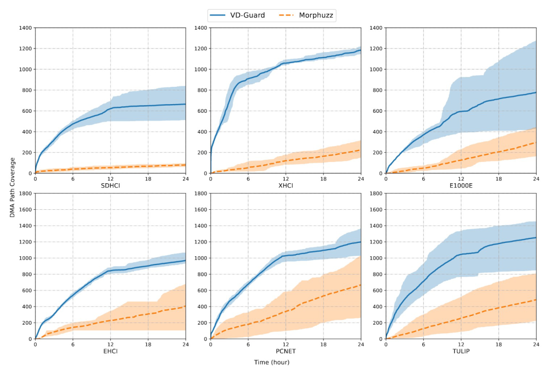 DMA路径覆盖对于Hypervisor的Fuzzing十分重要,这个实验比较了MORPHUZZ和VD-GUARD在6个虚拟设备上的表现。图3说明VD-GUARD在24小时内持续在所有设备上显示出更高的DMA路径覆盖率(平均2.1倍)。特别是对于XHCI,VD-GUARD发现的DMA路径是MORPHUZZ的4倍。MORPHUZZ发现的漏洞数量较少与其较低的DMA路径覆盖率有关,这更凸显了DMA引导模糊测试的重要性。