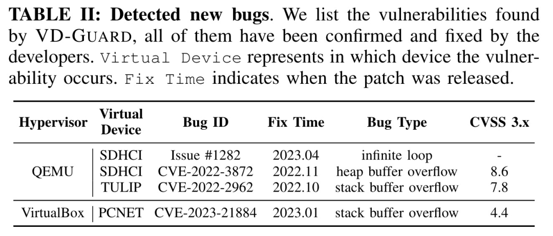 如表2所示,VD-GUARD在测试中成功发现了4个之前未知的虚拟设备漏洞。这些漏洞包括不同类型的内存错误,可能导致服务拒绝(DoS)攻击。其中三个由于安全影响严重被分配了CVE编号,特别是堆缓冲区溢出漏洞,可能还能被用于虚拟机逃逸攻击。