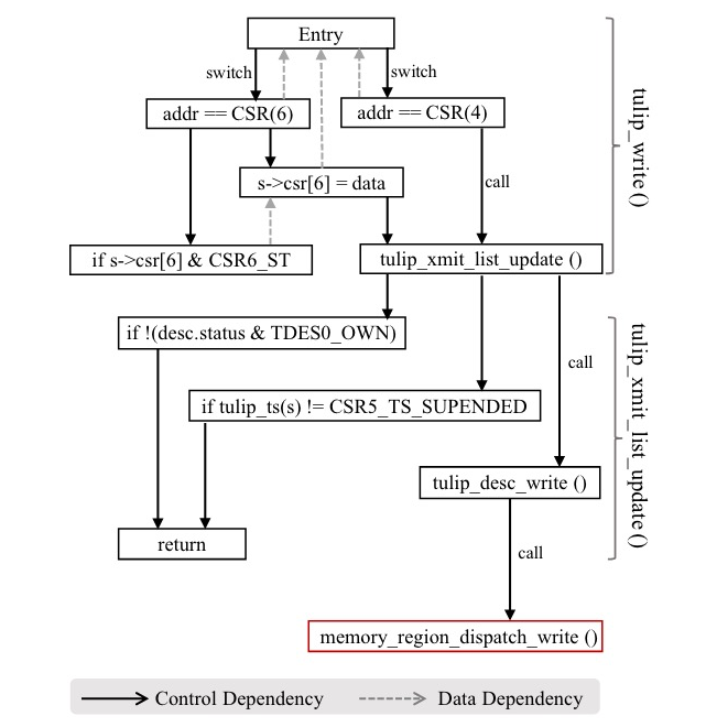 本文针对Hypervisor中的虚拟设备进行漏洞挖掘,提出了DMA引导的Fuzzing方案,设计并实现了VD-GUARD的原型系统。VD-GUARD首先通过静态分析识别了DMA相关的操作序列,然后将其作为Fuzzing的反馈,这样可以增强对不同DMA逻辑状态的探索,进而在虚拟设备中发现更多DMA相关的漏洞。根据实验评估,VD-GUARD在QEMU和VirtualBox中发现了4个0-day漏洞。