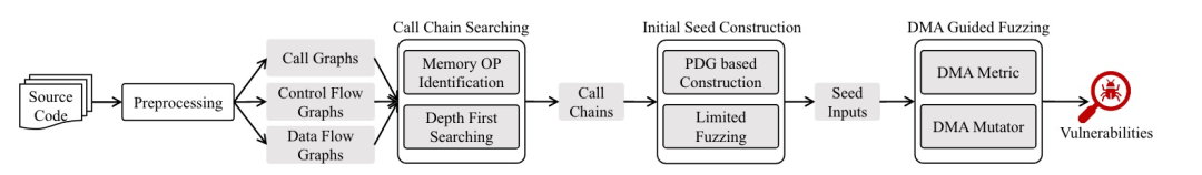 针对上述问题,作者开发了VD-GUARD工具,其架构如上图1所示,主要包含两个部分,分别是静态分析和Fuzzing。静态分析部分主要有两个功能,分别是寻找能够触发DMA操作的路径,作者将这一步骤称作Call Chain Searching;以及构建初始种子。Fuzzing部分作者使用了静态分析的结果进行DMA Guided Fuzzing。