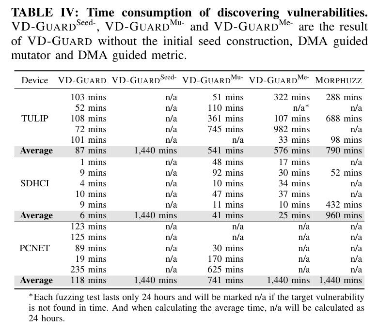 实验评估了VD-GUARD三个组件的有效性:初始种子构建、DMA Guided Metric和DMA Guided Mutator。为了进行这些评估,MORPHUZZ、VD-GUARD及其变种在3个虚拟设备上进行了24小时的测试。表4说明启用了所有组件的VD-GUARD平均在120分钟内发现漏洞,但是移除任意一个组件都显著增加了发现漏洞的时间(3.9倍至218倍),这个实验证明了这三个组件对于Hypervisor中虚拟设备中高效漏洞发现的重要性,突出了它们对Fuzzing的贡献。