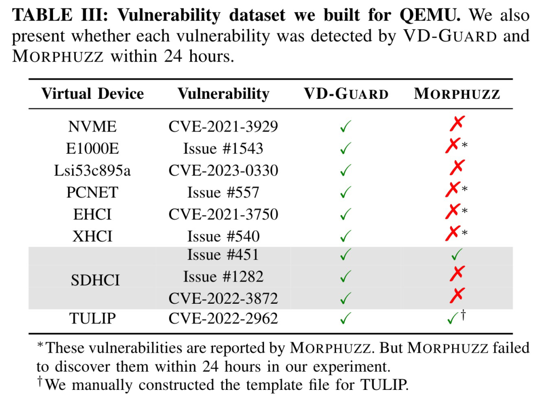 如表3所示,在漏洞挖掘的实验中,VD-GUARD 在24小时内成功发现了数据集中的全部10个漏洞,而MORPHUZZ只找到了3个。另外,尽管MORPHUZZ在OSS-Fuzz项目中报告了E1000E、PCNET、EHCI和XHCI设备的漏洞,但在此次实验中24小时内并未发现这些漏洞,实验结果的差异可能与Fuzzing的设置有关。这表明VD-GUARD能显著提高虚拟设备漏洞发现的效率。