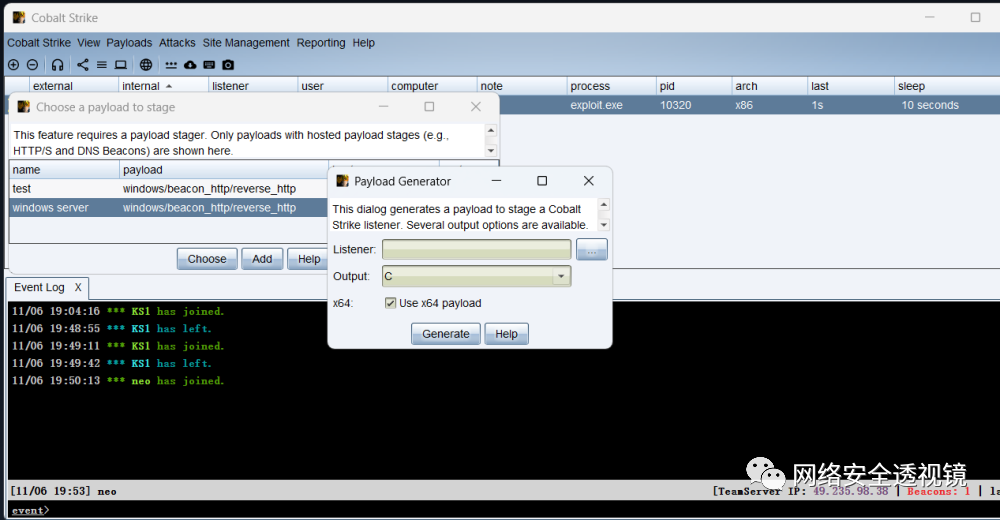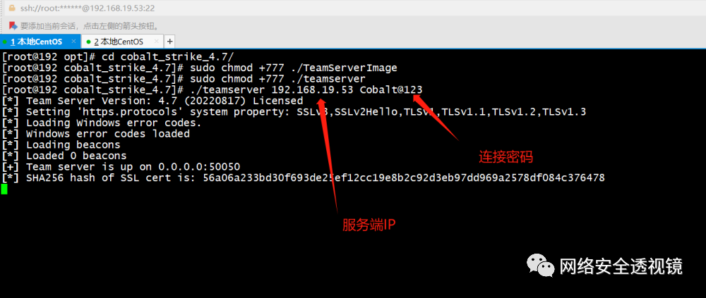 cd cobalt_strike_4.7/sudo chmod +777 ./TeamServerImagesudo chmod +777 ./teamserver./teamserver 服务器IP 密码