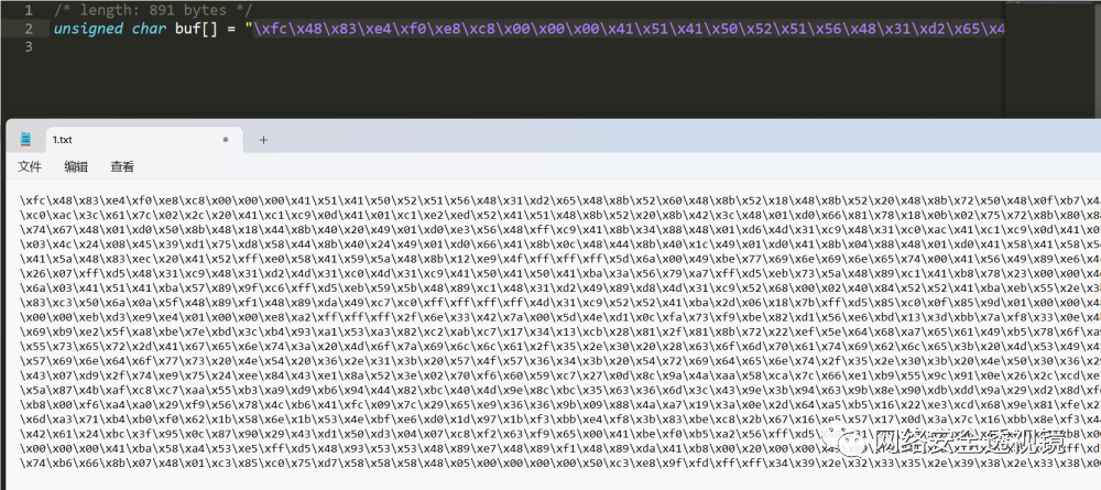 将上面生成的payload.c里面的双引号里面内容,复制粘贴到1.txt文件中