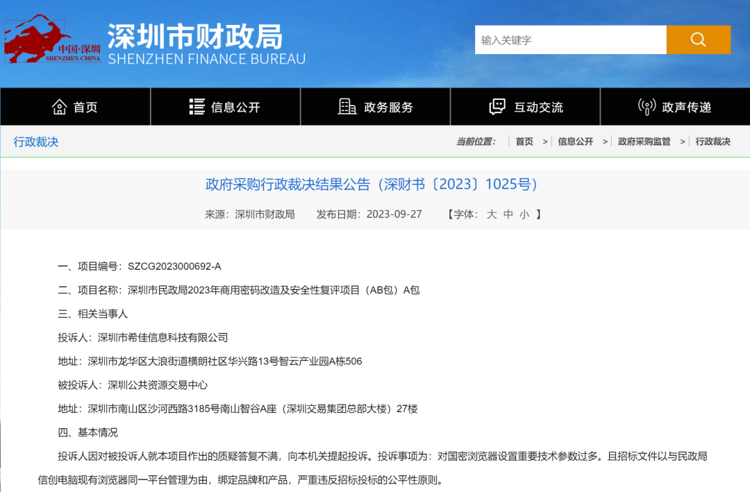 财政局:国密改造项目涉嫌指定品牌,中标无效!近日,深圳市财政局发布政府采购行政裁决结果公告(深财书〔2023〕1025号),本项目为深圳市民政局2023年商用密码改造及安全性复评项目,本项目于9月开标