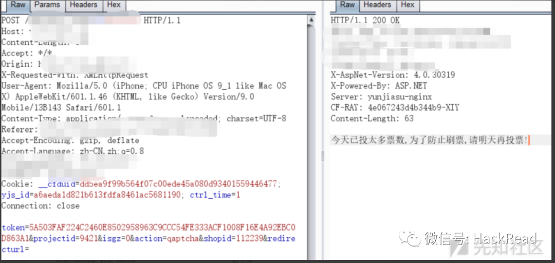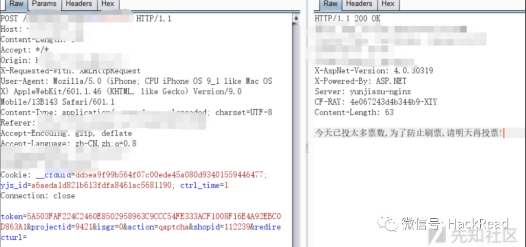 利用前面方法我们无法进行刷票了,都被限制了,这时我们可以利用并发线程,简单来说就是让服务器处理跟不上请求速度,线程还没有达到需要验证的地方已经发出去了很多请求,用Fiddler批量发包,导致服务器没有跟上处理,导致刷票,出现问题的几率比较高