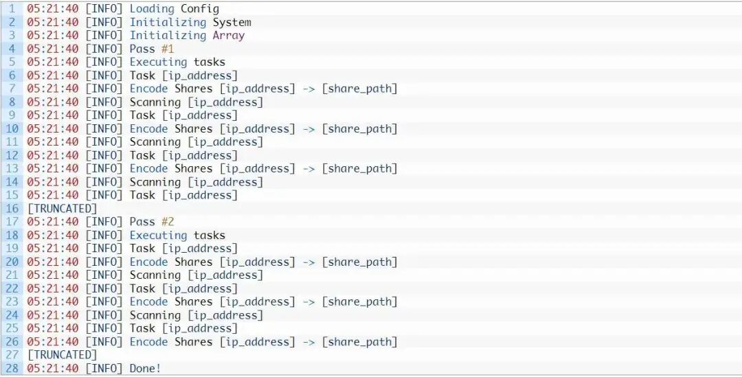 创建这些有效负载后,恶意软件继续遍历所提供的配置,目的是感染指定的任何SMB/CIFS驱动器。这些尝试在写入STDOUT的各种输出中进行了概述,其示例如下所示。