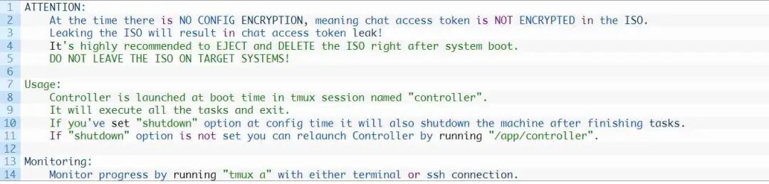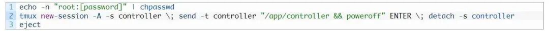 在此过程中,恶意软件最初将虚拟机的根密码更改为攻击者选择的密码。它随后通过内置的tmux实用程序生成一个新的终端会话,该实用程序用于执行名为controller的恶意软件二进制文件。恶意软件完成执行后,会关闭虚拟机。