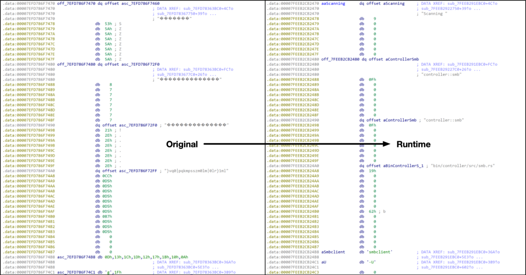 控制器恶意软件是用Rust编程语言编写的,其方式与BlackCat恶意软件家族非常相似。在执行时,控制器最初将使用唯一的单字节异或操作解密大量字符串。
